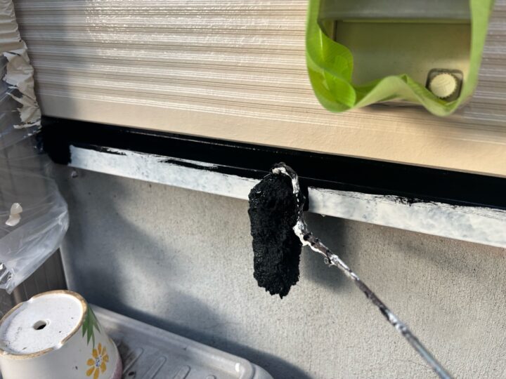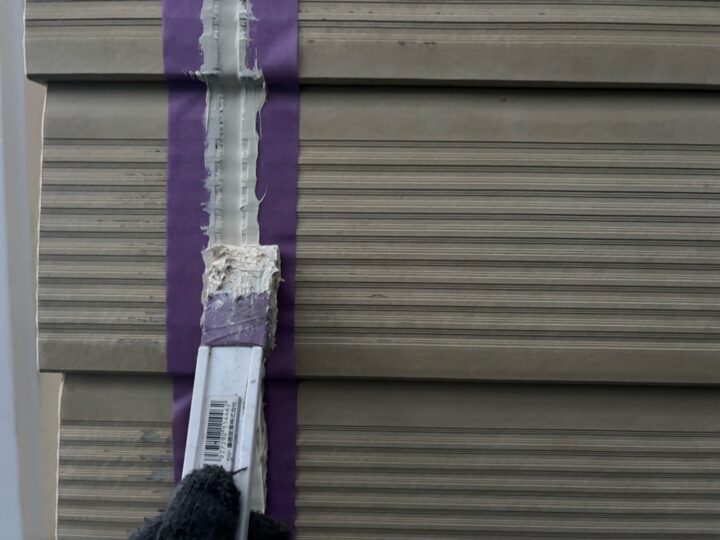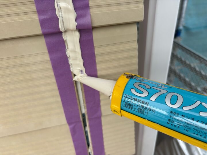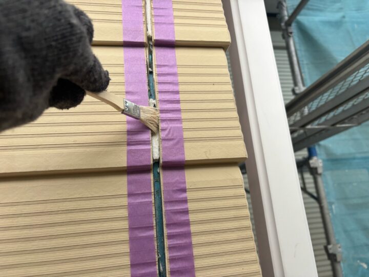 下地とコーキングの密着性を向上させるため、専用のプライマーをしっかりと塗り込みます。