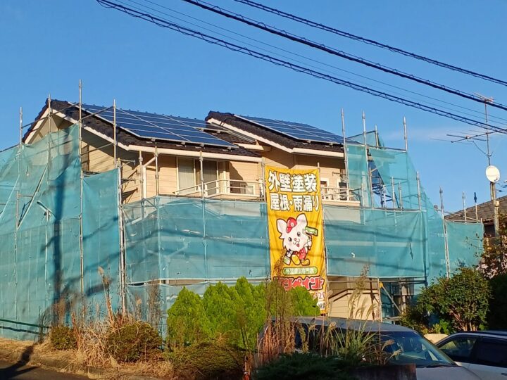 足場を組み立て、ネット養生します。足場を立てる前にご近所様へのご挨拶は弊社の方で行わせていただきます。