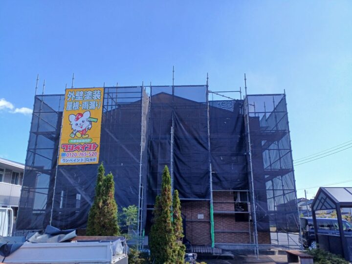 足場を組み立て、ネット養生します。足場を立てる前にご近所様へのご挨拶は弊社の方で行わせていただきます。