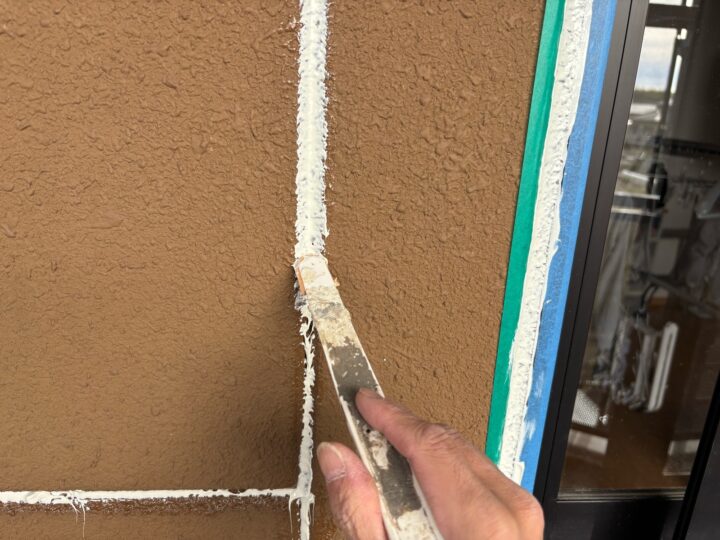 奥までコーキング材が入り、外壁とコーキング材が密着するようヘラでならします。