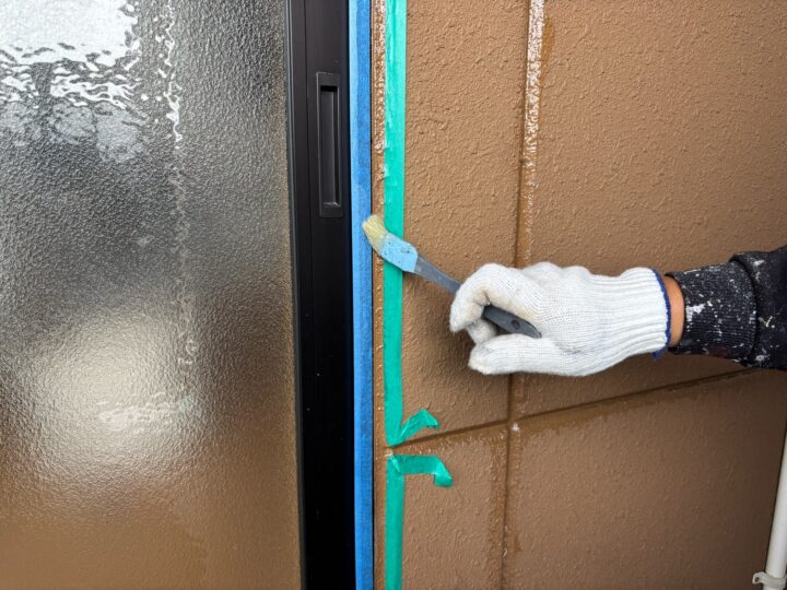 下地とコーキングの密着性を向上させるため、専用のプライマーをしっかりと塗り込みます。
