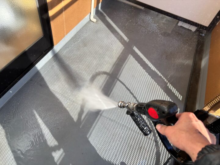 ベランダ床の蓄積された汚れや黒ずみを洗い流すと、一気にきれいになっていきます。