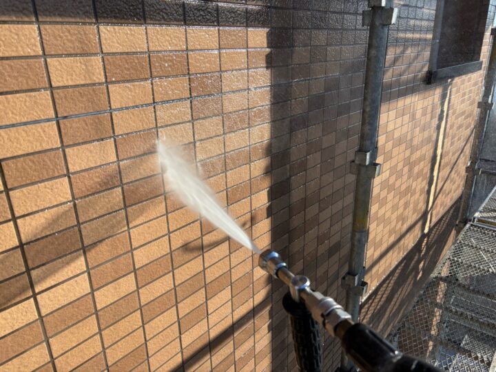 業務用の高圧洗浄機で、建物に付着した汚れを、綺麗に洗い流します。